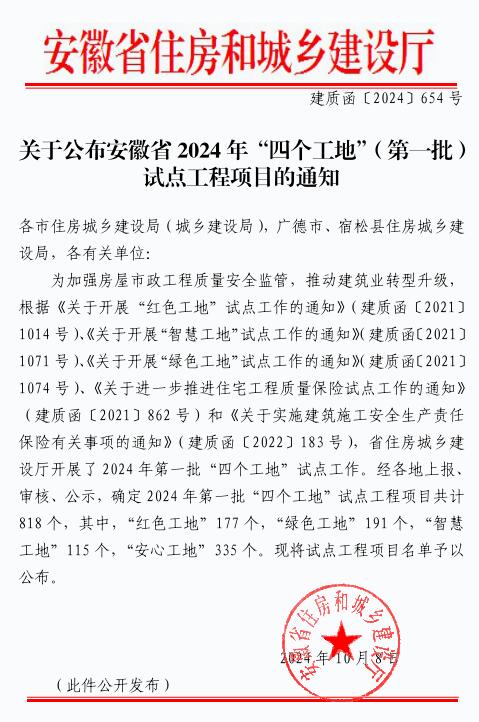 近日,安徽省住房和城鄉(xiāng)建設(shè)廳發(fā)布了2024年“四個工地”(第一批)試點工程項目的文件中,黃山徽信公司承建項目再榮獲2024年“紅色工地”、“綠色工地”、“安心工地”評定,這是繼獲得安徽省2023年“四個工地”試點工程項目后再次獲此殊榮。充分體現(xiàn)了徽信公司堅持嚴(yán)格按照“四個工地”的標(biāo)準(zhǔn)要求,在項目建設(shè)過程中認(rèn)真做好項目質(zhì)量安全管理工作,嚴(yán)格要求實施全過程施工管理,抓實每處施工細(xì)節(jié),嚴(yán)控質(zhì)量夯實整體施工品質(zhì),在保質(zhì)量、保安全的前提下推動項目進度建設(shè),憑借優(yōu)異表現(xiàn),榮獲安徽省2024年“紅色工地”、“綠色工地”、“安心工地”,我公司將再接再厲,繼續(xù)保持優(yōu)良水準(zhǔn),打造精品工程,在當(dāng)前行業(yè)形勢嚴(yán)峻的環(huán)境中努力奮進。